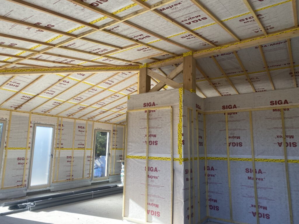 Implantée en partie haute du terrain, la maison principale est conçue selon les principes de la maison passive. Cette construction bois à haute technicité repose sur une isolation thermique renforcée, une étanchéité à l’air optimisée, des menuiseries à haute performance et une ventilation double flux avec récupération de chaleur. L’objectif est de réduire drastiquement les besoins en chauffage et en climatisation tout en garantissant un confort intérieur durable.